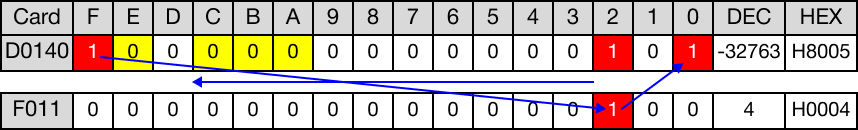 When the instruction is reenergized, the value of the WORD data register, D140, changes from 23,552 to -32,763.