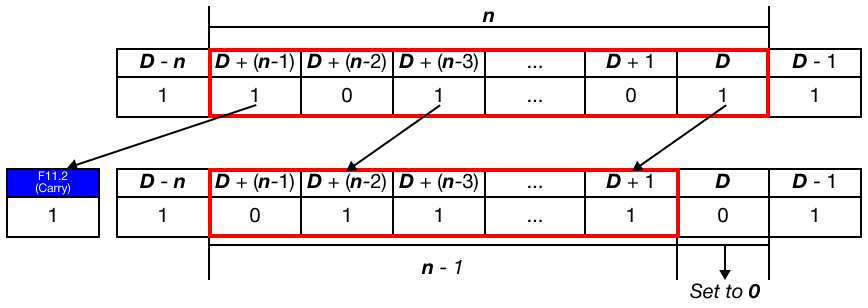 - n-bit data is shifted to the left starting at the BOOL data register, D.