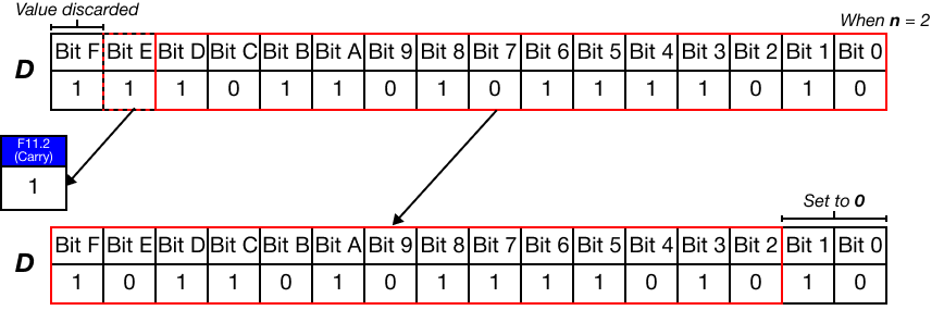 - Data from bit 0 ~ n-2 are lost after the instruction executes.