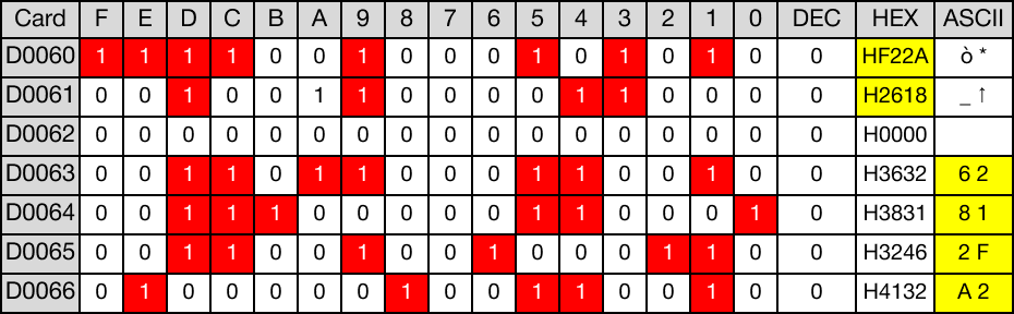 When the contact, M2.6, is powered ON (1), the DBINHAP instruction converts two Hexadecimal data registers, D65 and D66, into ASCII code.