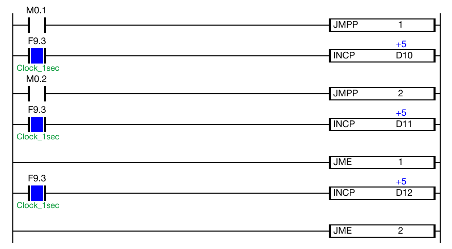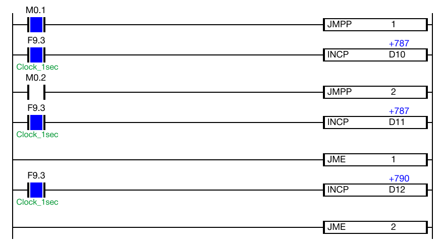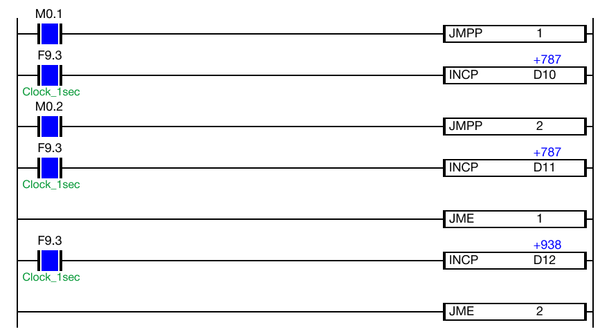 When the contact, M0.1 is powered OFF (0) and the contact, M0.2, is powered ON (1), the value of the data registers, D11 and D12, no longer increases every 1 scan.