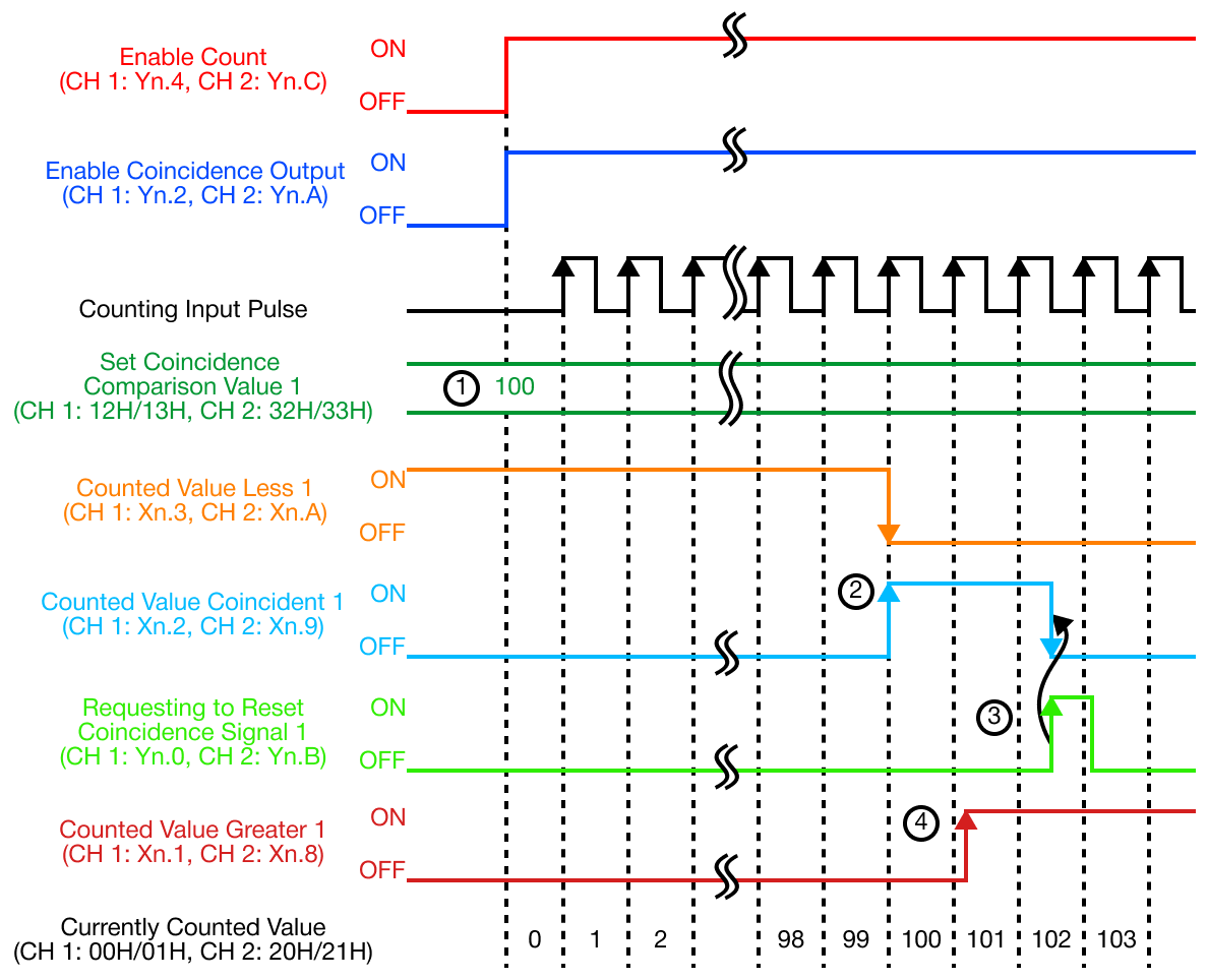 | 2 | When the currently-counted value is equal to the set coincidence output value, the counted value less is OFF and the counted value coincident is ON. |