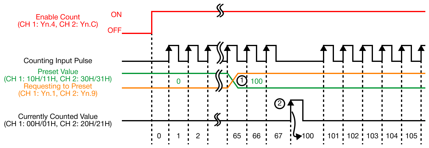 | 2 | At the rising edge of the requesting to preset (Yn.1 or Yn.9), from OFF to ON, the currently-counted value of the buffer memory is set up as the preset value of the buffer memory. The value is preset irrelevantly to the enable counting (Yn.4 or Yn.C). |