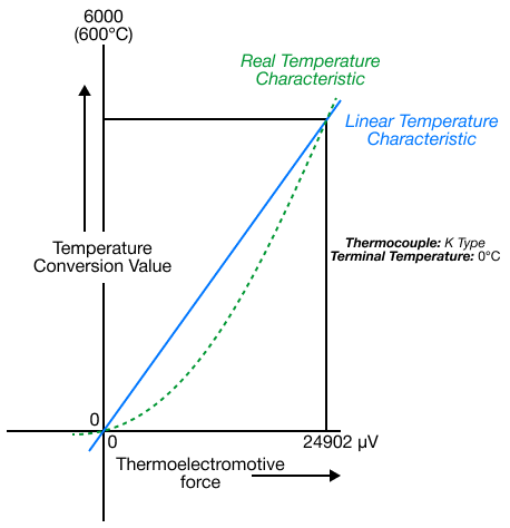 - The CM3-SP04ETO performs linearization for the electromotive force input from the thermocouple which is non-linear.