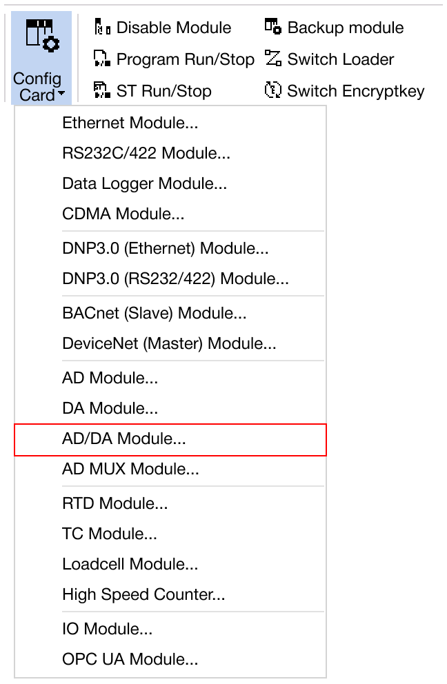 Navigate to Online → Special Module Setup → AD/DA Module or click on the AD/DA module within the Card Properties.