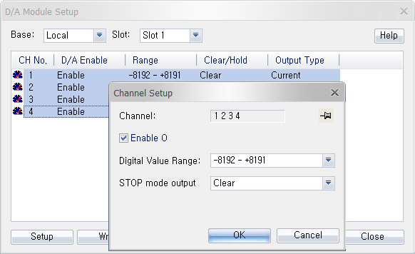 Click Setup to enable/disable the module, or configure the digital value range, STOP mode output, or output signal.