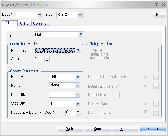 Configure the protocol, station number, baud rate, parity bit, data bit, stop bit, or response delay.