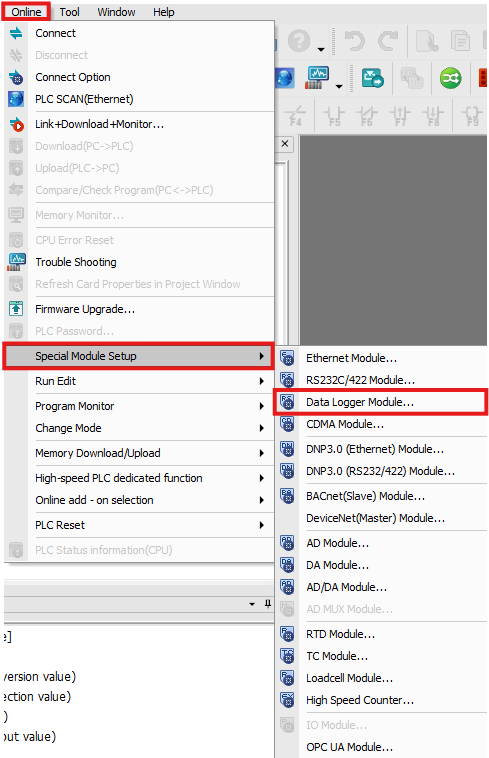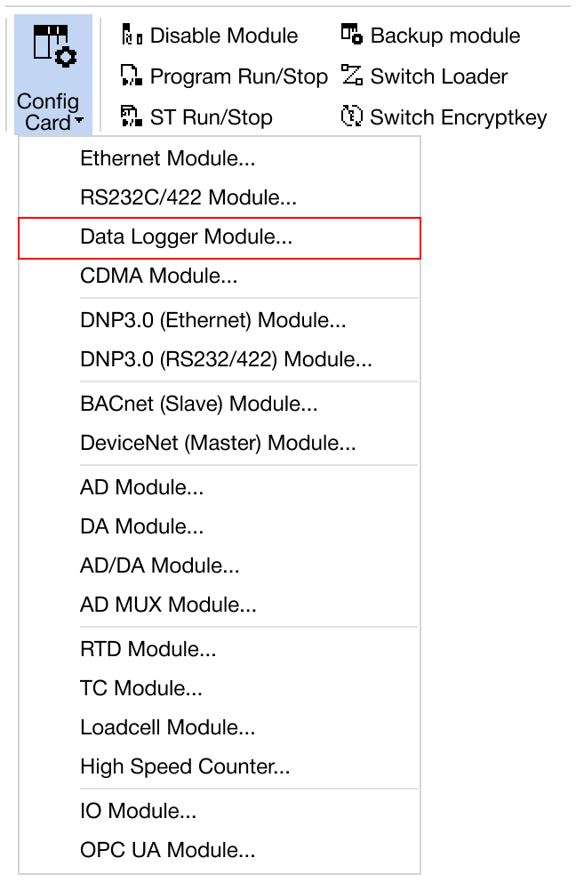 Navigate to Online → Special Module Setup → Data Logger Module or click on the Data Logger module within the Card Properties.