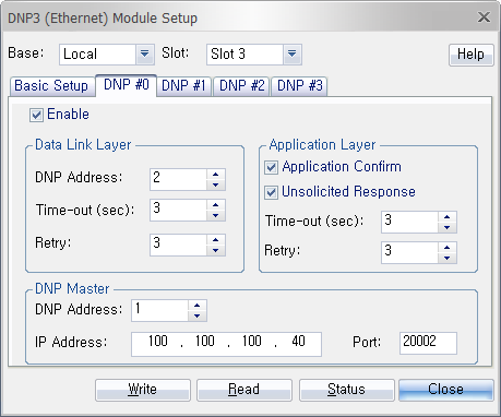 Configure the DNP3.0 settings: data link layer, application layer, or DNP master.