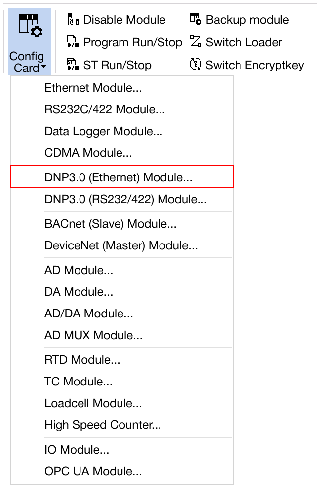 Navigate to Online → Special Module Setup → DNP3.0 (Ethernet) or click on the DNP3.0 Ethernet module within the Card Properties.
