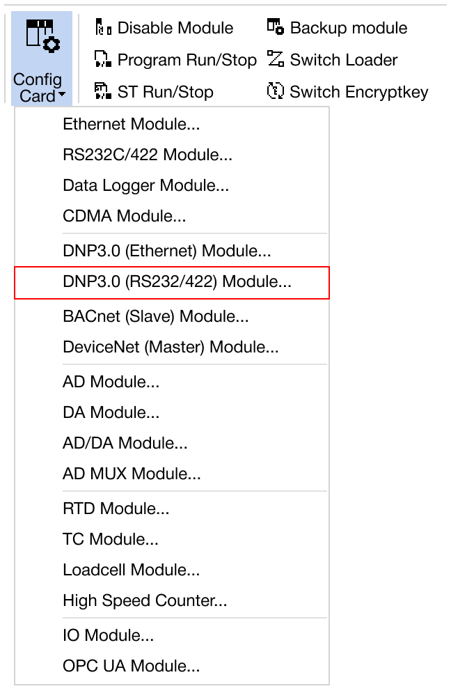 Navigate to Online → Special Module Setup → DNP3.0 (RS232C/422) or click on the DNP3.0 Serial module within the Card Properties.