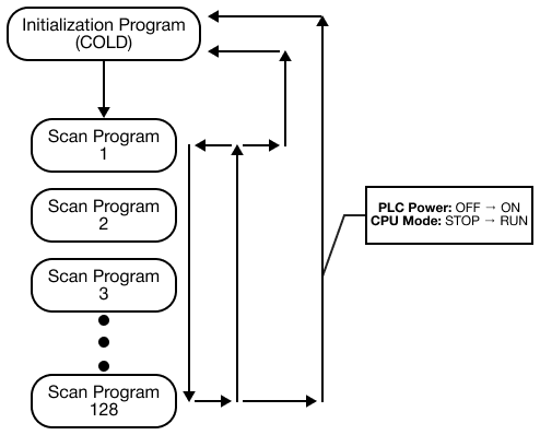 The cold start initialization program is executed when the CPU is powered ON or the CPU mode is switched from STOP to RUN. The scan program is executed after the cold start initialization program is complete. The cold start sets the initial data or initializes the peripheral and expansion modules to run in the scan program.