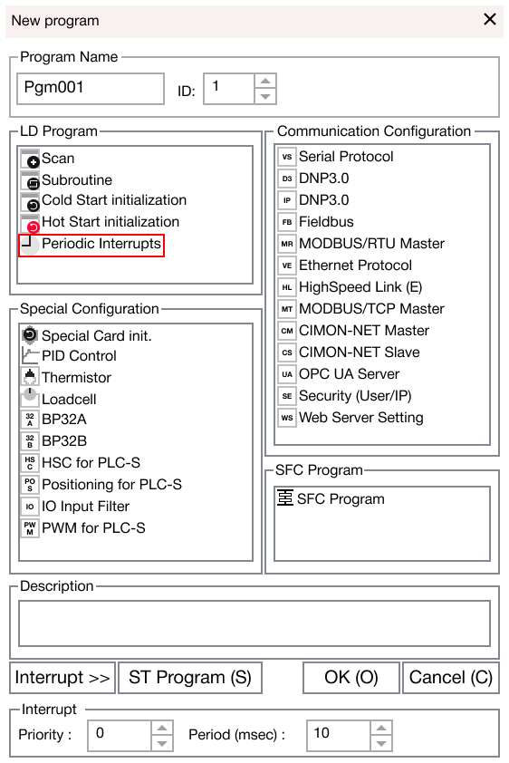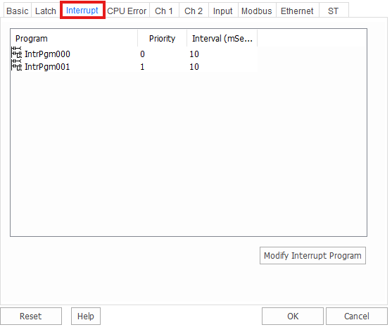 - Periodic interrupt programs can be configured under the Interrupt section.